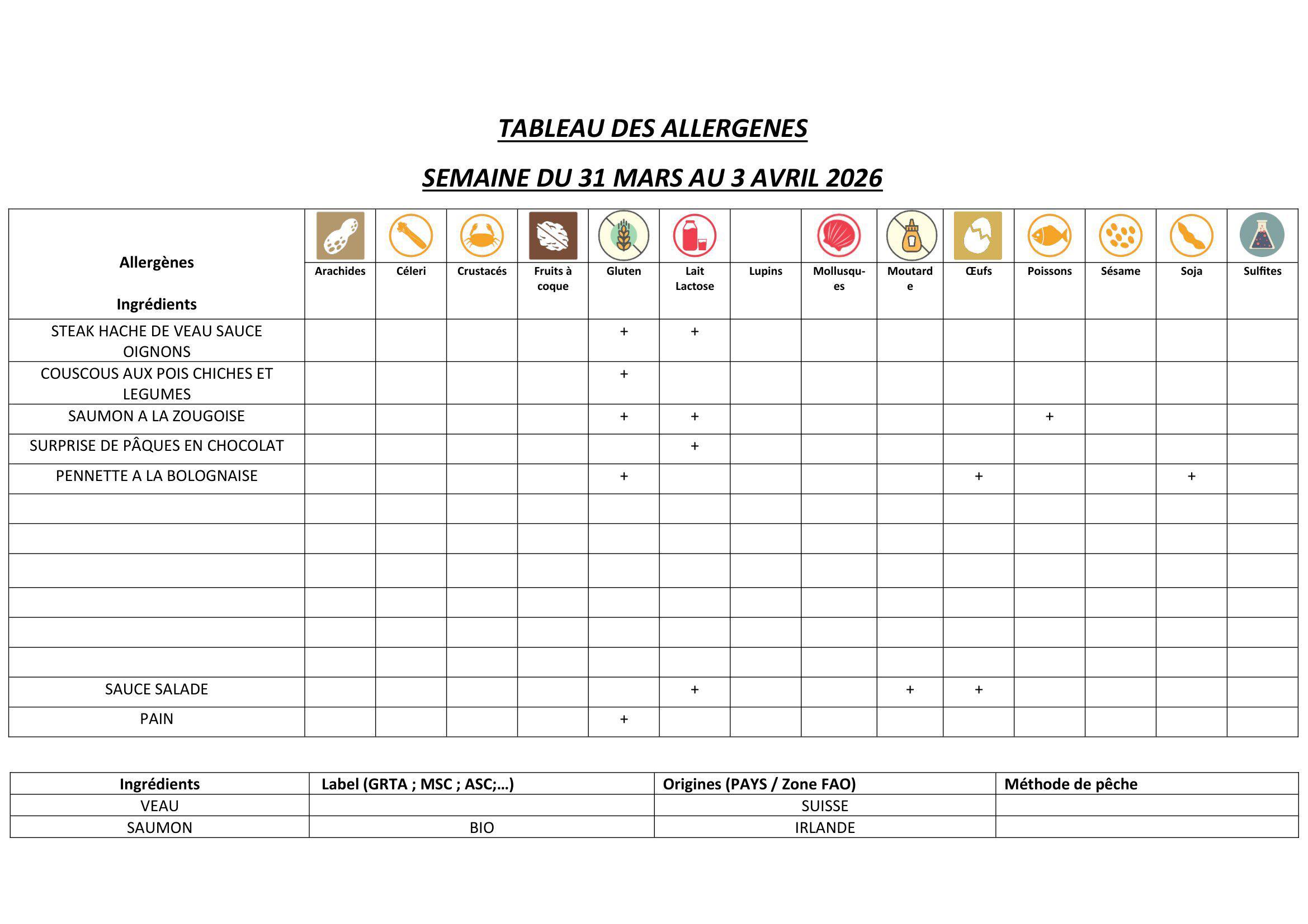 Lundi SALADE VERTE BIO GRTA ET CRUDITES STEAK HACHE DE VEAU (CH) SAUCE OIGNONS COUSCOUS AUX POIS CHICHES ET LEGUMES SALADE DE FRUIT FRAIS Pain mi blanc grta | Mardi SALADE VERTE BIO GRTA ET CONCOMBRE PAVE DE SAUMON BIO (IR) A LA ZOUGOISE POMMES NATURES ,CHOU FLEUR PERSIL SURPRISE DE PÂQUES EN CHOCOLAT Pain paysan grta | Jeudi SALADE VERTE BIO GRTA ET CELERIS MAIS PENNETTE A LA BOLOGNAISE GRANA RAPE FRUIT FRAIS Pavé meule de pierre grta | Vendredi